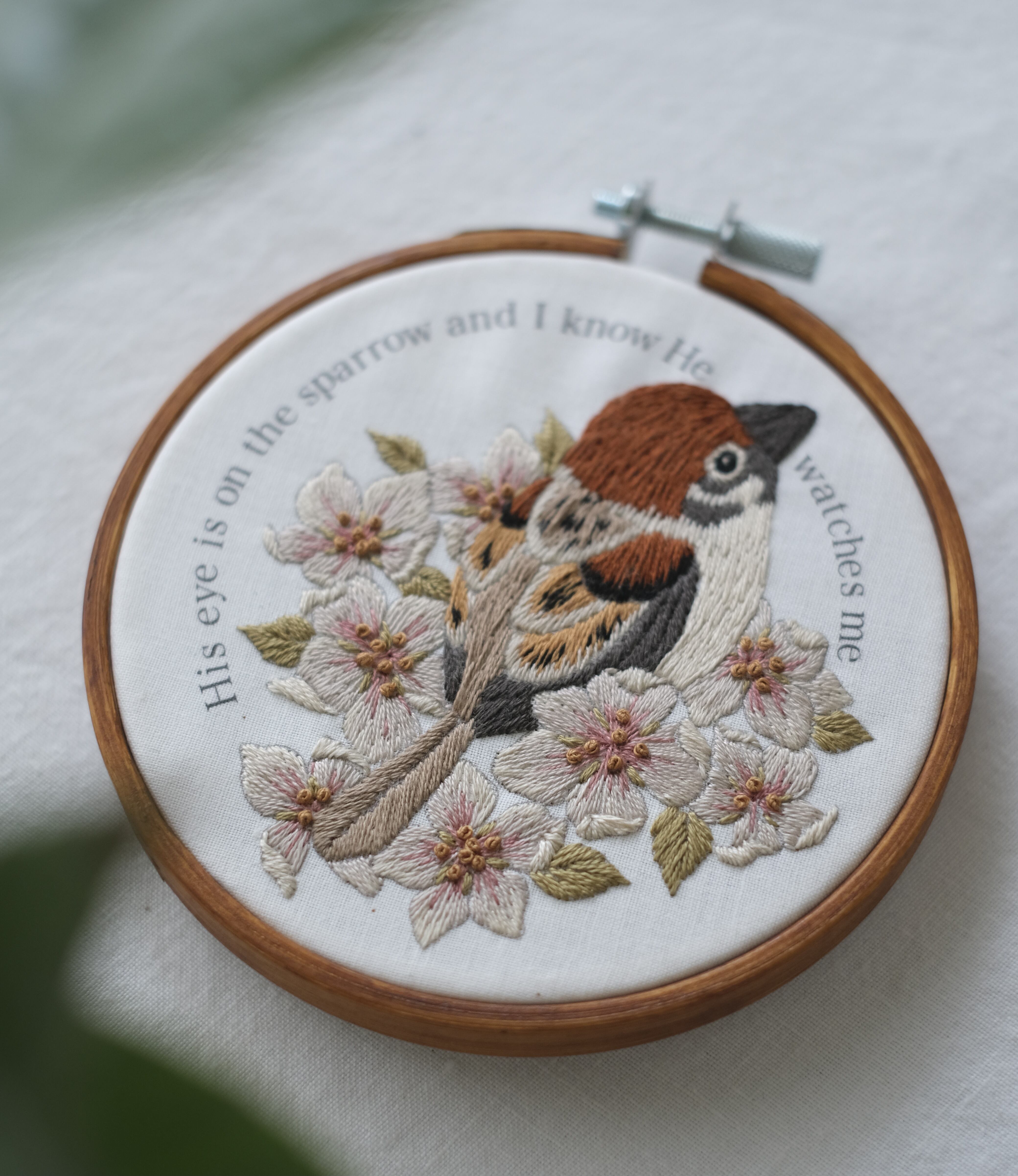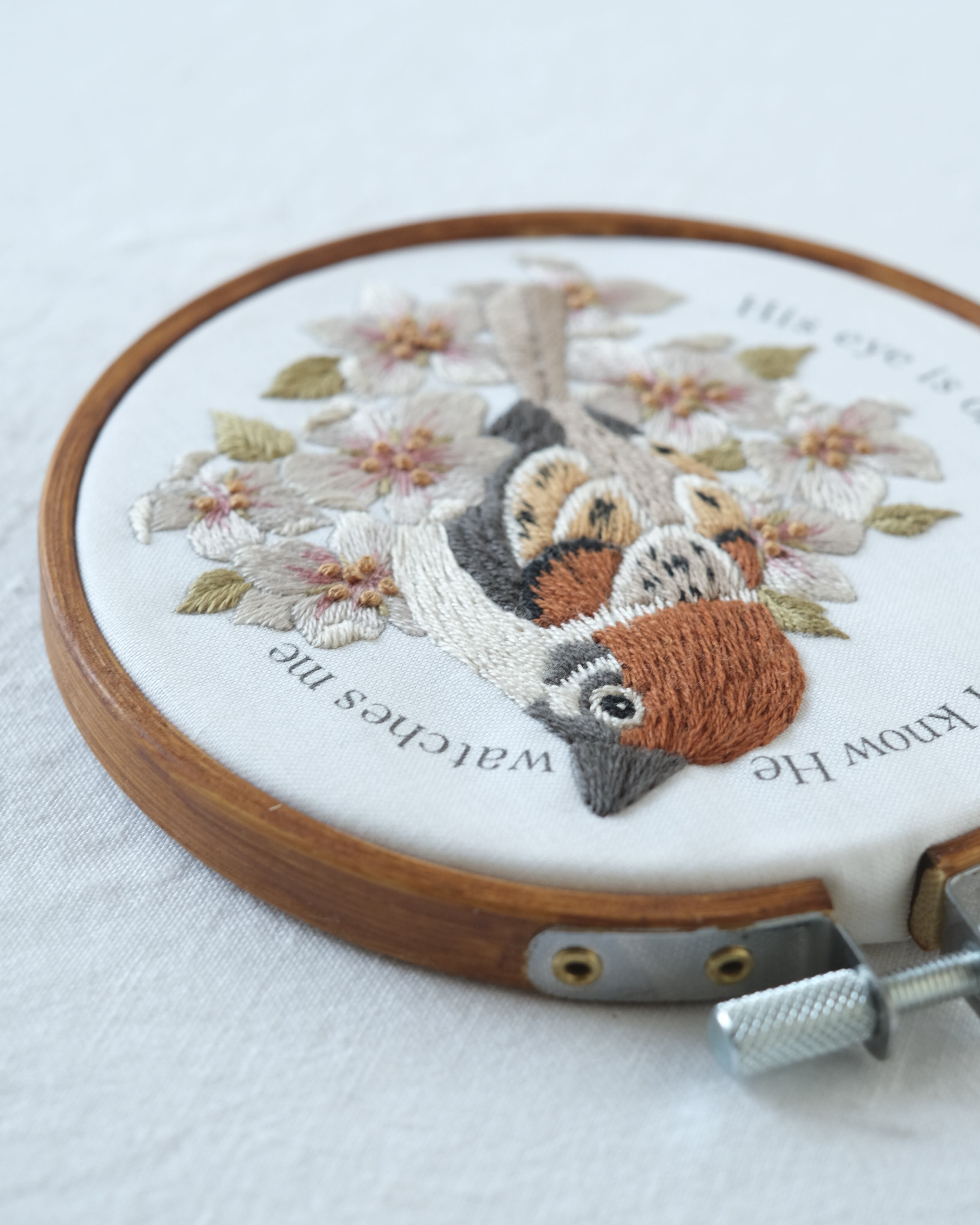 アーモンドの花が満開に咲く枝にとまる雀。春の優しい風に揺られながら空を見つめる様子が愛らしく、「わたしたちはいつも大きな愛に見守られている」というメッセージが込められています。