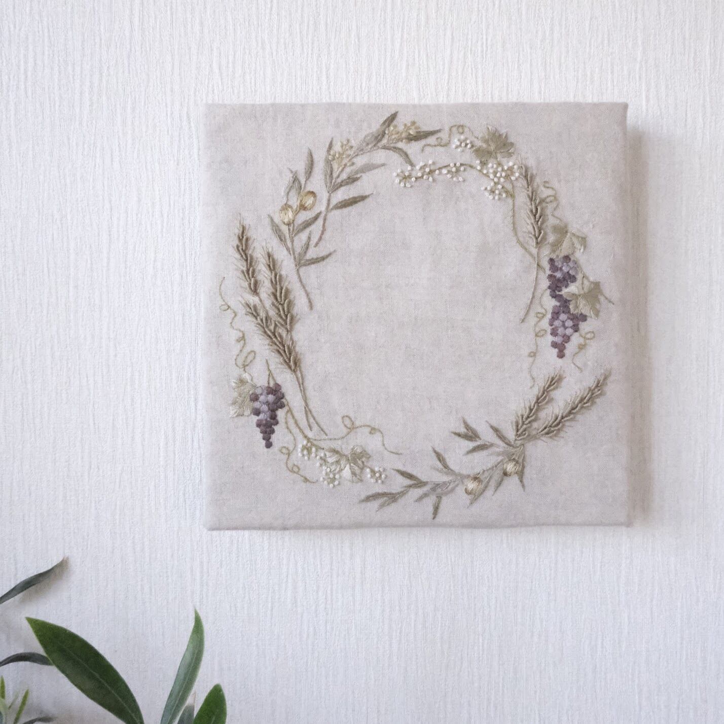 聖書に登場する植物たち、「麦の穂、ぶどう、オリーブ」をリースのデザインにしました。