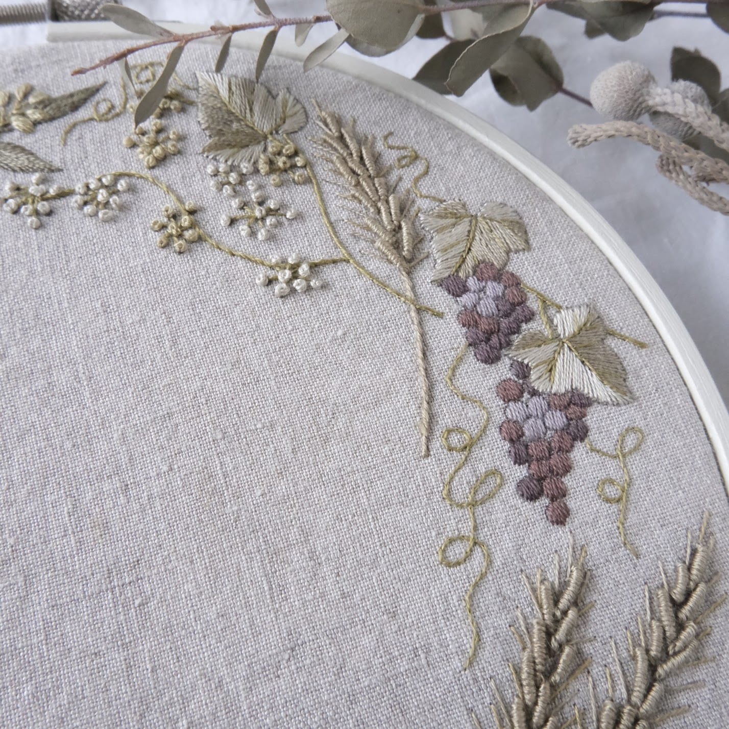 使用ステッチはサテンステッチ、、バックステッチ、ストレートステッチのど基本的なステッチの他に、コロニアル(フレンチ)ノット、ブリオンステッチなど中級ステッチなどで構成されています。複数のステッチがバランスよくデザインされ、満足感のある図案となっています。