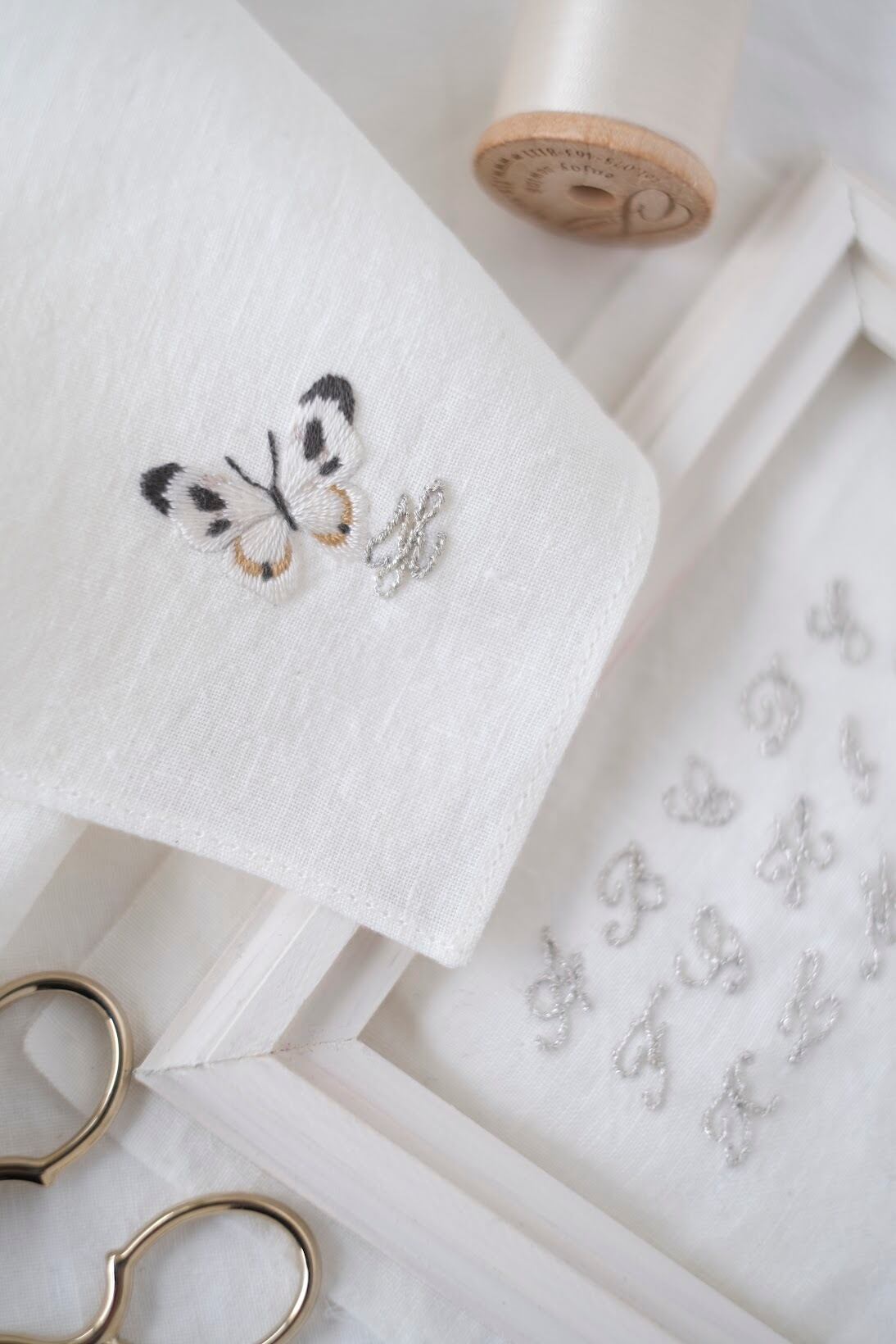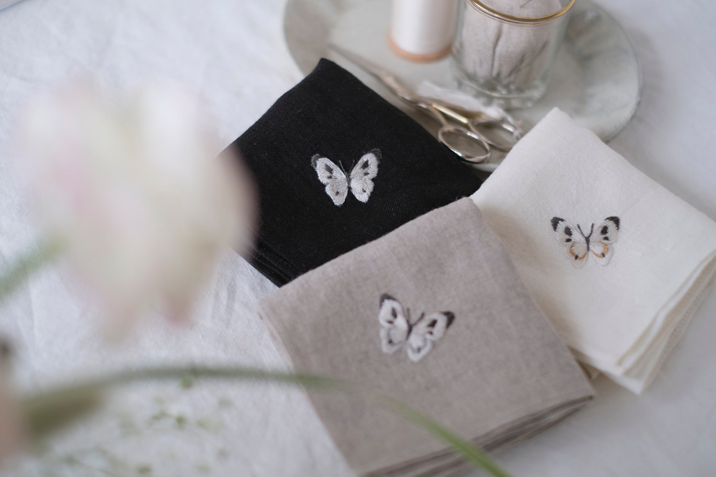 繊細な紋白蝶の手刺繍は、機械刺繍にはない高級感があります。