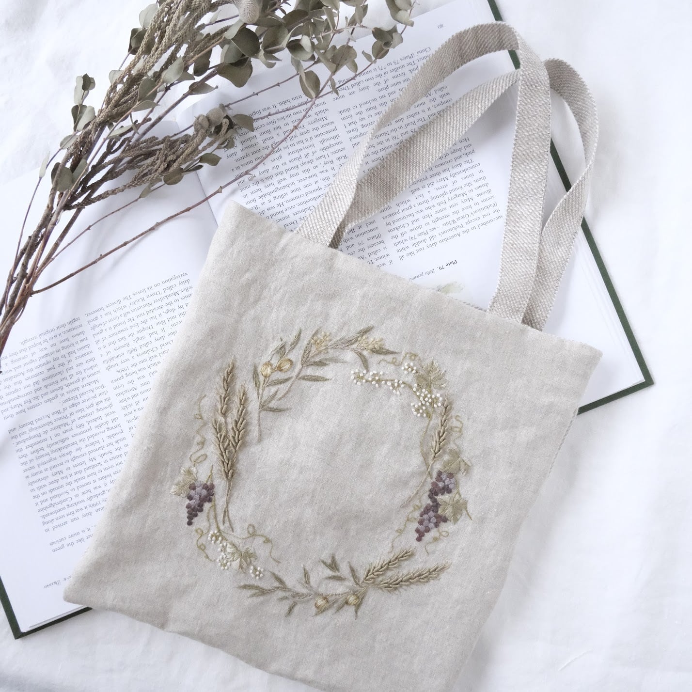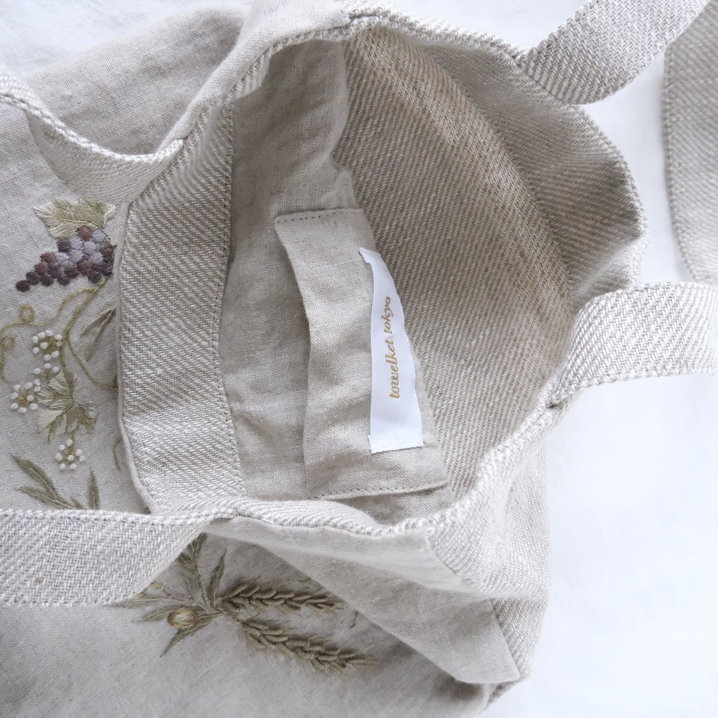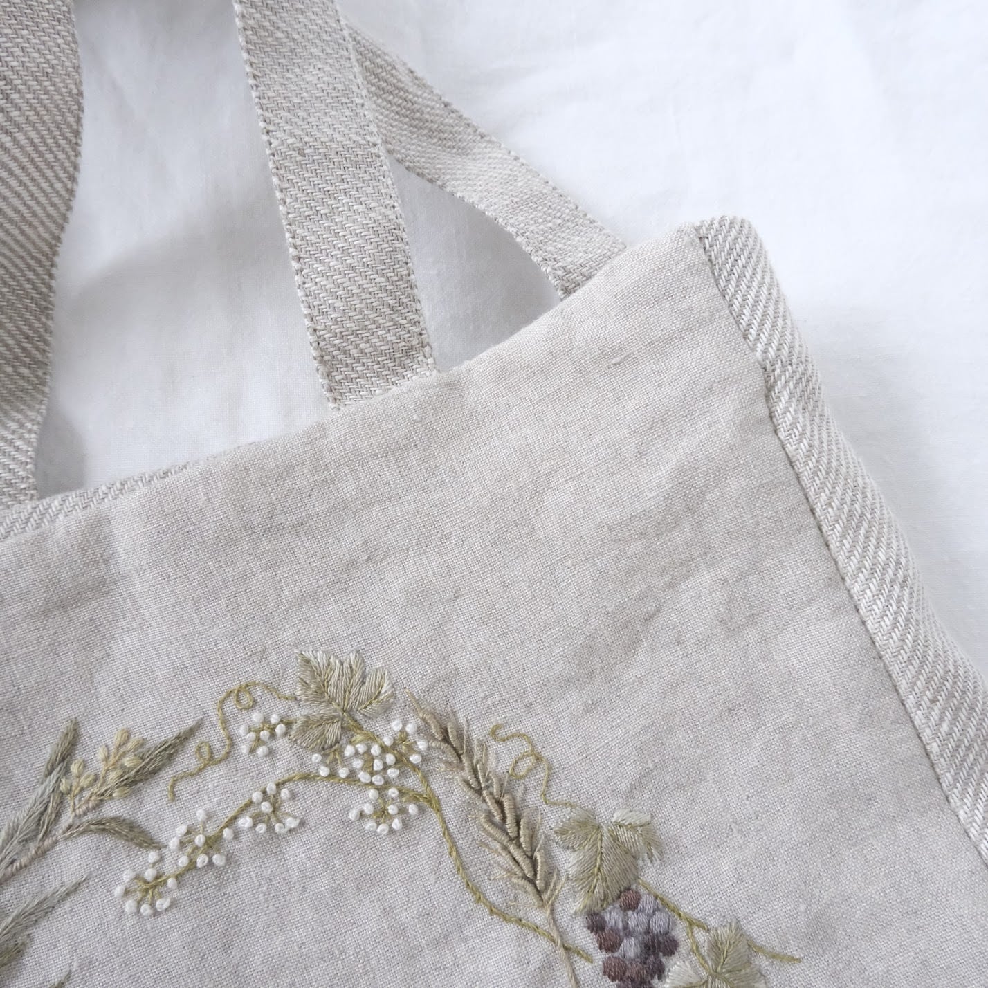 繊細な色選びとステッチ、リネンの儚げな風合いがマッチしています。