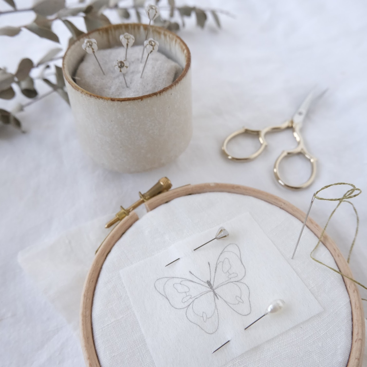 図案を仮止めしたり、立体的な刺繍をするのに欠かせないまち針。